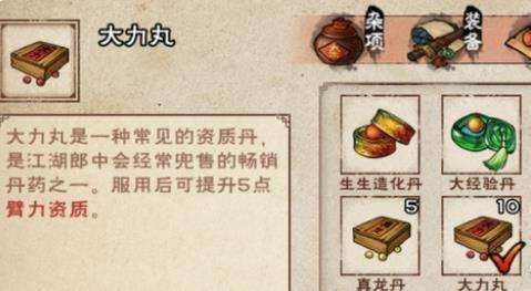 配方:甘草*14、枸杞*10 效果:增加5点臂力资质[每位角色仅限服300粒]