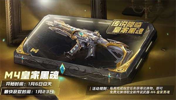 为了让战士们在新的一年里取得更好的成绩,瘦普这次又准备了一份超级好礼!没错,战士们最爱的传说级武器免费送活动又来了!本次活动中将为战士们送出的是传说级武器:M4-皇家黑魂。活动将于1月6日正式开启,战士们每周完成指定任务,获得兑换物,最早可于1月23日兑换这把传说级武器!