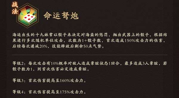 战法:十九妹使用骰子进行摇树,能够准备到很多的资源,玩家们在将海盗击败的时候可以得到很多资源,十九妹的数字能够让我们攻击次数增加,当我们的数字到一的时候可能会让自己受到眩晕影响。