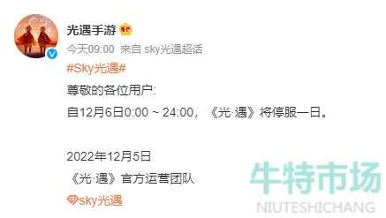 1、光遇游戏将在2022年12月6日00:00-2022年12月7日00:00停服一天;