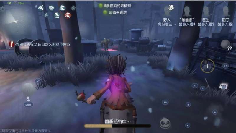 首先是基础打法,玩野人首先一定要明确这个角色的定位,明确了定位就明确了他的整体任务以及对局基本原则,野人的官方分类是救援牵制位,但他实际上还兼有一定的辅助能力,并且这个辅助能力真的不算弱,属于是中等水平偏强势的。虽然说破译速度慢,但是牵制能力无与伦比,野人的牵制能力就是所有角色里面最强的并且没有之一,同时救援和辅助能力也是可圈可点,这样的一个溜鬼救人辅助修机的四维分布以及他的定位就决定了野人的基本思路就是在完成破译任务的基础上利用自己强大的三围来承担团队的各项危险任务。