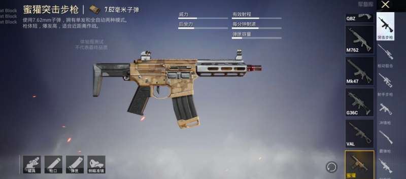 蜜獾突击步枪使用7.62mm子弹,拥有单发和全自动两种模式。