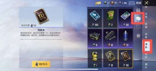 进入之后点击右侧的道具按钮,选择第二个选项下滑到最下面就可以找到改名卡了,通过100游戏点卷购买可以获取。