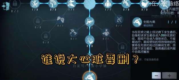 比较骚气的玩法就是在只有最后一个密码机要解的情况下压住一点等等自己的队友防止一刀斩,比如去救人,之后直接果断加速跑路。大心脏毕竟可以让倒地的秒起而且附带几秒钟的超快移动速度加成光速跑路,化险为夷搭配在一起过后还能不倒地。同时,这个天赋由于提升了玩家的操作容错率避免出现一个人倒后面全盘皆崩,在地图庄园中的重要性也是越来越大了,基本在庄园的玩家都会带。有时候别人带你不带,队友都会指指点点,这些都不管。个人觉得低端局不带没问题,但是高端局因为要打好配合,在大家水平都差不多的情况下,别人都带你不带就有点落后了,出现失误也不好去挽回,而且没有携带的话很多团队协作就没办法完成所以带一个会好点。
