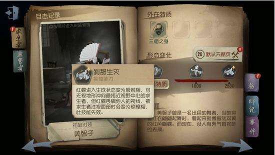红蝶是个和风的人物,它曾是个优秀的舞者。身着一袭红衣起舞的它,就像是要飞走的蝴蝶。到了庄园之中却没人敢直视它的舞蹈,因此它被叫做红蝶。大家最熟悉它的应该是它的技能,不能给人带来什么伤害,但是能追人。在刚开局的时候就能用,而且它的冲刺是很快的。它的冷却也不怎么费时,只需要八秒又能够重新用,同时也没有地形的限制。这就是说它不会去做什么板窗之类的,而是在看到人之后可以直接用自己的技能冲过来,这就给它省了很多的时间。另外大家还要知道,红蝶的形象是有三种的。在选好了人物之后它是默认美人相的,用这个形象的话它就是行动快另外还有比较小的竞技范围。因此在人没注意的时候,它可以直接用技能一下子来到人身边。但更多的时候在场上,它都是般若相的。但在翻窗户和柜子的时候,它是不会用这种相的。并且在做其他的行动的之后,它还会变身。它在换形态的时候是不会变的,但在用般若和惊惶时有点不好的作用。比如说警戒的区域要大一些,并且行动也更慢一点。想要玩好它的话,首先就是要用好技能。因为它的刀是比较窄的,所以在砍人的时候不太准。因此最好是用刹那生灭去一下子靠近人,然后再迅速击中它。在场上的时候就是要多用这招。