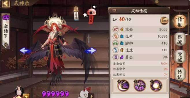 1.图为迦楼罗满级面板。满级的迦楼罗数据一般,两个S一个A还算可以,但两个B拉低了他的综合数据,并且攻击也只有3000出头,先天条件相对于其他SR级式神来说没有优势。