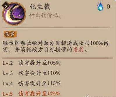 2.一技能化生戟,普攻技能,系数是125%(满级),迦楼罗普攻过后,会消耗掉目标身上的一层「惜羽」。