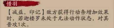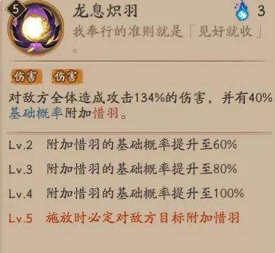 5.三技能龙息炽羽,这是一个三火的主动技能,可以给对方全队造成134%的伤害,并为敌方全体概率附加「惜羽」印记。而在三技能满级情况下则必定附加「惜羽」印记。对于不缺资源的斗技老玩家来说可以考虑养一只尝尝鲜,开发一下好玩的阵容。对于萌新来说,PVE方面,迦楼罗可能只能打一些特定的副本,不考虑斗技的话培养价值不高,整一两只白板放在式神录里备用即可。