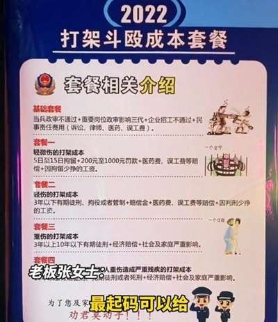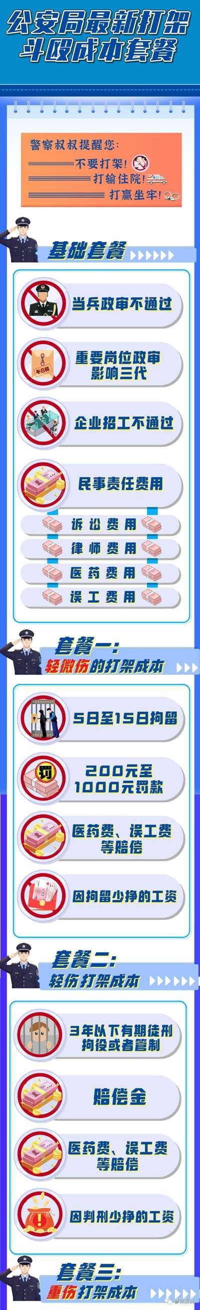 2022最新打架斗殴成本套餐介绍,最近社会上发生了不少的恶性打架斗殴的事件,我们都知道打架斗殴是违法的,对双方来说都会带来很严重的后果,最近公安发布了打架斗殴成本套餐的宣传单,那么看看成本套餐的介绍吧。