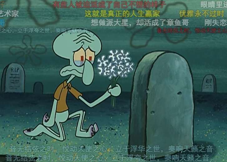 b站up主@傲世子木,以章鱼哥的视角自制了一个鬼畜视频。成年了之后再回过头来看章鱼哥,才更像我们成年人的现状,放弃了理想埋葬了梦想,到蟹堡王当一个小收银员,忍耐着吵闹的环境,偶尔独奏一曲竖琴。
