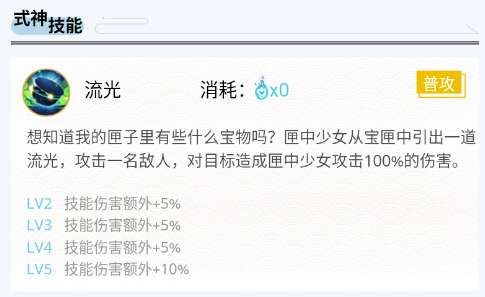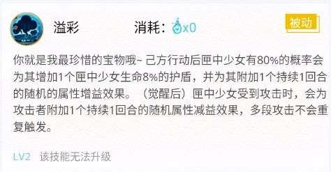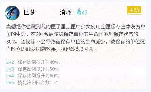 分析:匣之少女最大的特点就是第三技能可以回溯到两个回合之前,我们先来逐个看看技能再说,第一技能无特点就是平A,第二技能是给队友增加护盾和增益状态,以及给对方增加减益效果。第三技能则是保存队友生命,等到两个回合之后或者队友死亡则回溯到保存时的30%的生命。