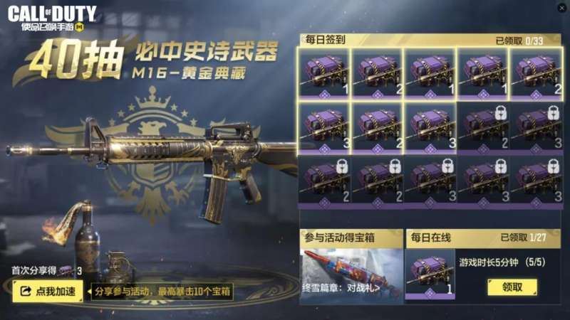 2、玩家参与宝箱40抽必得史诗级武器蓝图:M16-黄金典藏。