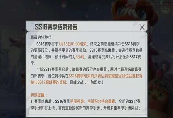 SS16赛季将于1月18日01:00结束。结束之前您能继续冲击SS16赛季的更高段位,并赢得更多的赛季奖励。SS16赛季结束后,会进行赛季数据的清理和结算,预计时间约为6小时。清理结算完成后将开启全新SS17赛季。