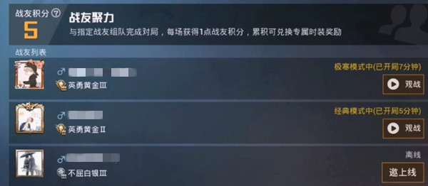 简单来说是游戏玩家要好友一起游玩,这一个作用主要就是让老玩家回归游戏,让玩家去邀请朋友在线,随后一块匹配游戏就可以获取战友积分。游戏玩家经过做活动获取积分兑换礼盒装。