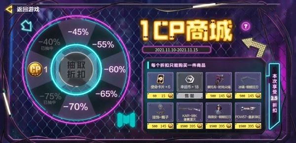 2、玩家可以在11月10日至11月15日期间,参加1CP商城系列活动抽取对应的折扣。