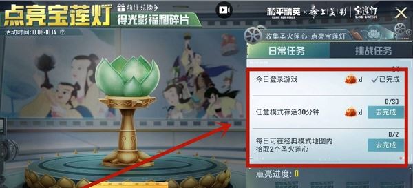 2、如上图所示,大家点击点亮宝莲灯活动,就能顺利的去做日常任务和挑战任务来获取圣火莲心了。
