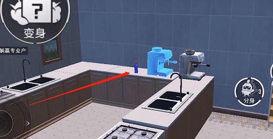 1、躲猫猫酒瓶就在搜索者厨房里,如上图所示,就在厨房的桌子上面,大家前往后,对准酒瓶就可以变身了。