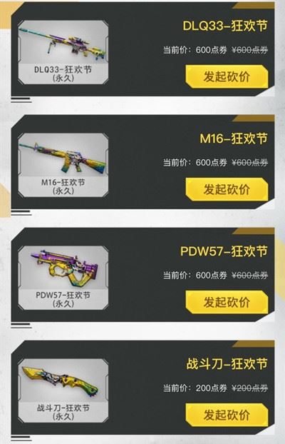 三把狂欢节枪械的原价都是600点券,而战斗刀的原价是200点券,通过玩家间的互助砍价将有机会以更低价格入手。