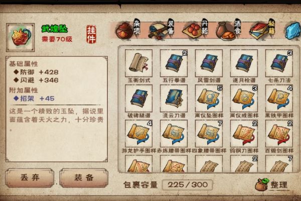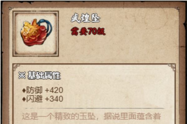 2、武煌坠的基础属性是防御增加420点,闪避增加340点。