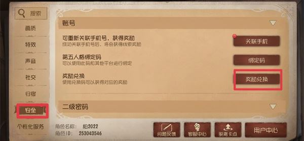 3、最后在安全界面,选中【奖励兑换】按钮。