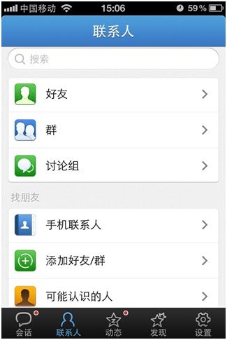 此外,最下面的tab第二个改成了“联系人”,联系人里面分类:好友、群、讨论组、手机联系人(此前没有听说)、添加好友/群、可能认识的人。加人加群以前在乐吧里面,现在也挪到了联系人里面了,以前好多次要加人的时候都到处翻,找在哪里加,现在总算放到个合适的位置了,加人加群都方便很多。