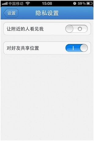 还有个变化就是以前那个“我”的选项现在变成设置了(这次好多地方改的更简单容易理解了,以前设置在“我”里面,搞不清逻辑)。个人名片什么的都移到了设置里,还加入了个人资料修改和隐私选项。这隐私选项可以设置是否让附近的人看见。这免去了笔者经常被人当成妹子搭讪的烦恼~~