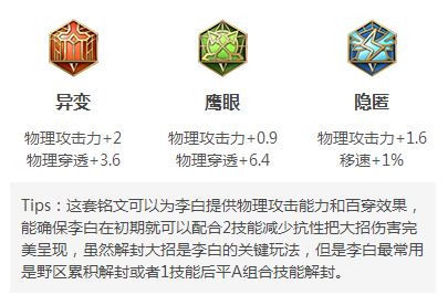 解析:该铭文主要是让李白的物理护甲穿透能力得到提升,附加的物理攻击虽少,但是可以通过其他铭文和装备来提升物攻。在李白等级达到中游水准时,敌人会针对李白的刺杀出很多增加护甲的道具,物理护甲穿透能力可以无视敌人的部分护甲值直接对敌人造成伤害,是中后期输出必备的强力属性。
