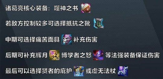 诸葛亮到了后期伤害极高,特别是带有斩杀效果的大招,推荐出装:魔女斗篷、血魔之怒这两件装备适合战士型英雄用来针对诸葛,魔女是必备的。