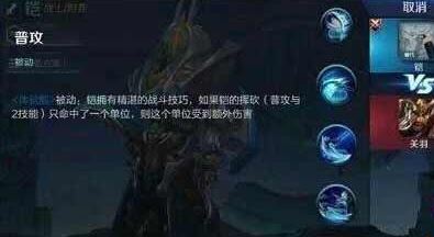 被动:铠拥有精湛的战斗技巧,如果凯的挥砍(普攻与二技能)只命中了一个单位,则这个单位受到50%额外伤害。