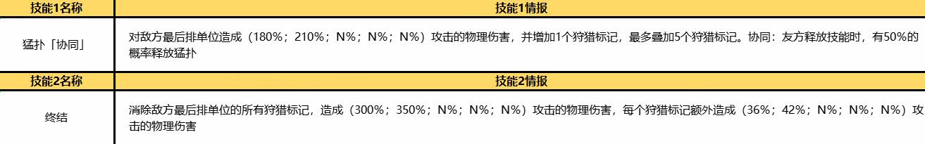 消除敌方最后排单位的所有狩猎标记,造成攻击的物理伤害,每个狩猎标记额外造成攻击的物理伤害。