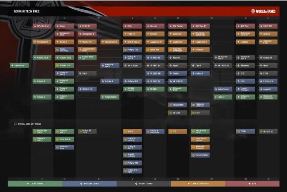 2、每一个国家都有三个不同类别的坦克可供研究,科技树会列出每一部坦克的详细属性。