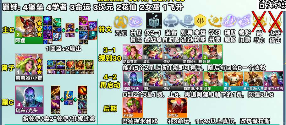 2、羁绊效果:4堡垒3学者3命运3次元2花仙子2女巫1飞升者;