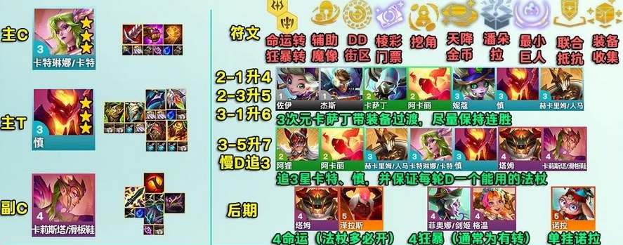 3-1升6,3-5升7慢D找3星卡特,可以选择法杖来加成保证连胜和血量,